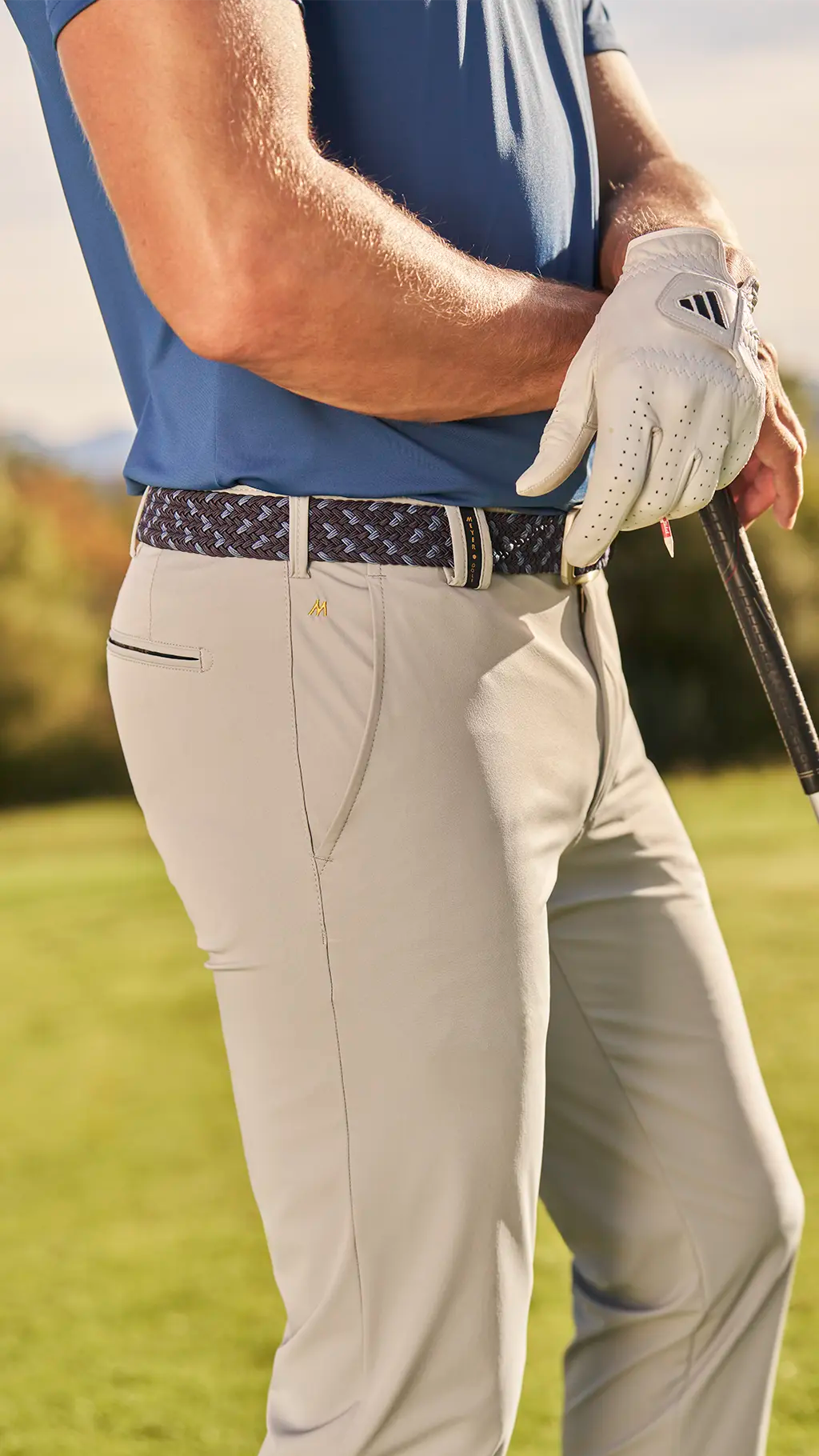 Onze eersteklas golfbroeken hebben een moderne pasvorm en elegante kleur. In de semi met de hand afgewerkte details komt het exclusieve karakter van deze chino's terug. De binnenkant van de achterzakken is met silicone gecoat en houdt de handschoen op zijn plek en de overhemdstopper in de band voorkomt dat het overhemd uit de broek glipt. De hoogwaardige binnenkant met kleurrijk geweven zak getuigt van de zorg die is besteed aan het maken van onze golfbroeken.