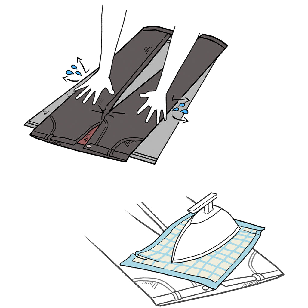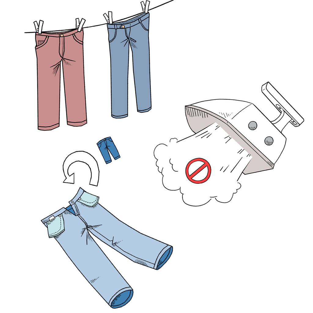 Nous recommandons de lisser les pantalons à la main et de les suspendre encore bien mouillés pour les faire sécher.