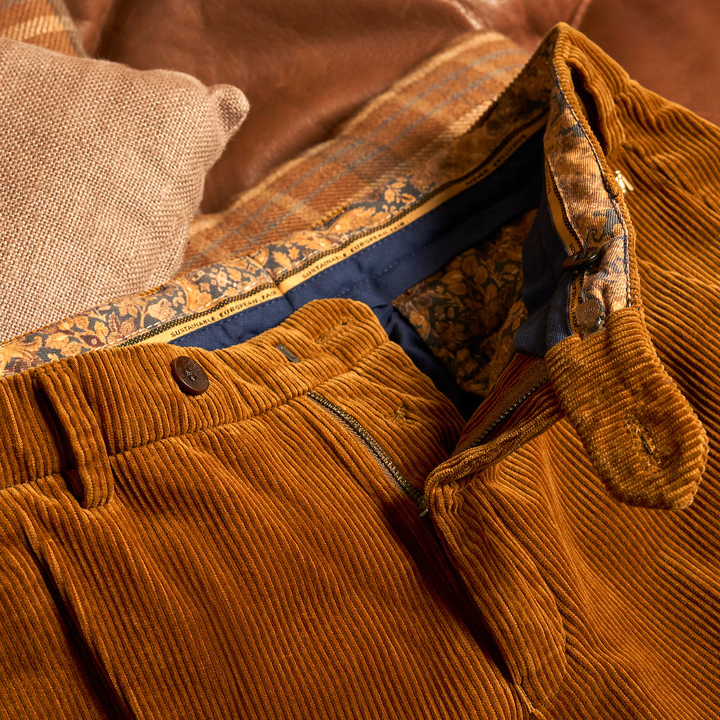 A pair of trousers is made from around sixty cut pieces of fabric, a good 380 meters of yarn, and a few trimmings. Many of the necessary production steps are done by hand. Inspired by the art of bespoke tailoring, we like to refer to this as semi-sartorial quality.